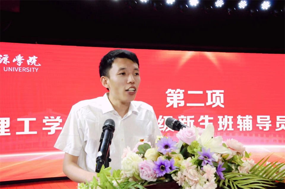 新生班辅导员代表景鹏在发言中郑重承诺,将以饱满的热情和高度的责任感,为新生们传授知识、答疑解惑,助力他们成长为有理想、有道德、有文化、有纪律的高素质人才。