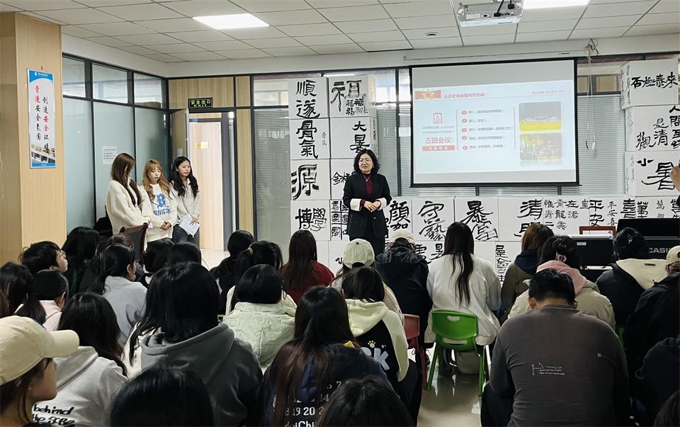 刘满荣以“从历史角度看对党忠诚”“共产党人如何做到‘对党忠诚’”两个方面引入,结合自身的入党经历,从案例和代表人物出发,指出做一名合格的党员必须真心诚意、尽心尽力、没有二心、知行合一、身体力行。她勉励同学们要志存高远、信念坚定、珍惜时光、学有所成,积极为学校高质量发展贡献自己的力量。
