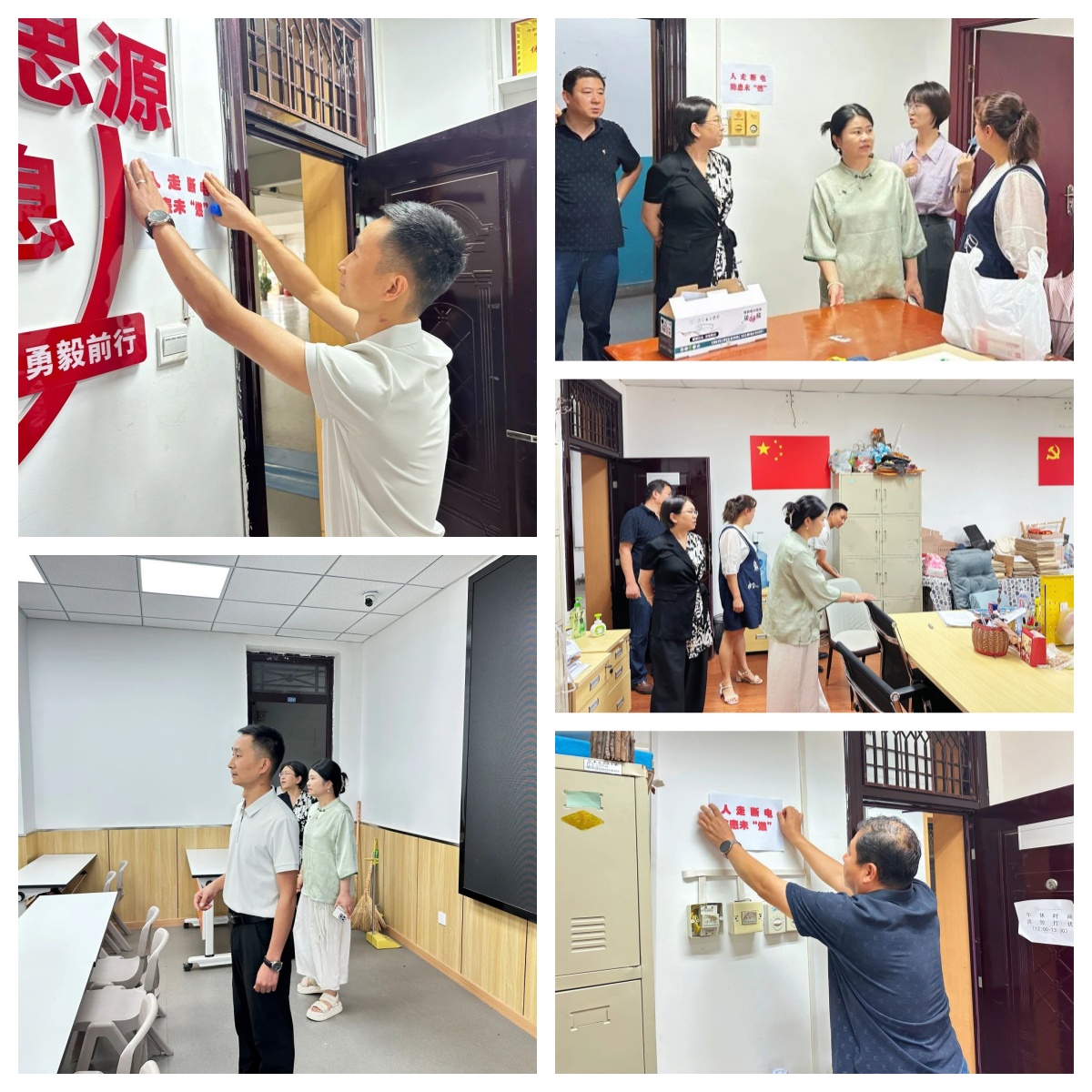 本次排查围绕用电安全、易燃物品管理等关键环节展开。班子成员带头分别在各办公室张贴“人走断电,防患未‘燃’”宣传标语,提醒教职工时刻保持安全意识。在用电方面,检查组重点查看电器使用是否规范,是否存在使用劣质充电设备、充电过程中违规操作等行为,严格落实“人走断电”制度,从源头杜绝电气火灾隐患。针对易燃物品,检查人员仔细核查纸张、书籍等易燃物存放情况,以及酒精、油漆等易燃液体的使用和存储是否符合操作规程,确保办公环境通风良好、危险品密封保存。