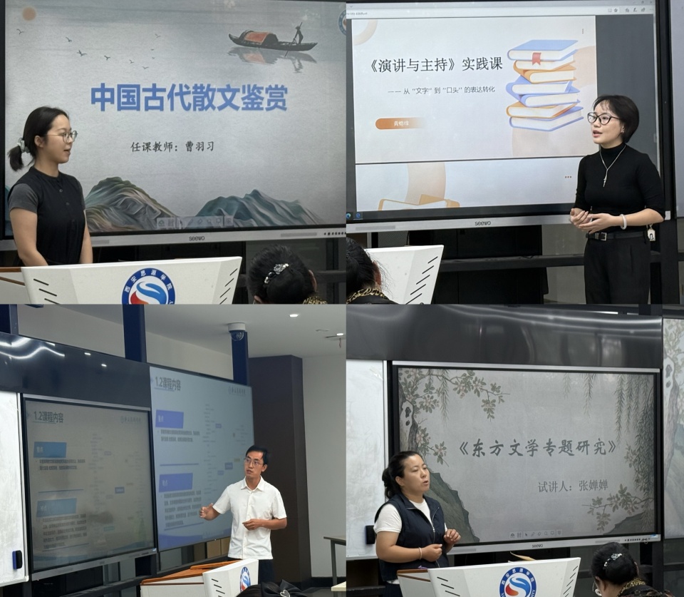 试讲过程中,各位教师充分展现专业素养与教学风采:陆大帅老师围绕《文献信息检索》课程核心知识点,清晰梳理信息检索逻辑与方法,张婵婵老师在《东方文学专题研究》试讲中,以鲜明的地域文化视角切入,用清晰的授课逻辑,带领老师们感受东方文学的独特魅力;曹羽习老师讲授《中国古代散文鉴赏》时,她深挖经典散文的文学价值与思想内涵,带领老师们体会了古代文学的审美韵味;许芸青老师针对《汉语要素教学》课程特点,结合教学实际设计教学环节,突出汉语教学的实用性与针对性;黄德缘老师在《演讲与主持》试讲中,通过案例演示与技巧讲解,生动呈现演讲主持的核心能力要点;张艳辉老师讲授《中国古代文学3》时,以时间脉络为线索,系统梳理相关时期文学发展脉络与代表作品。