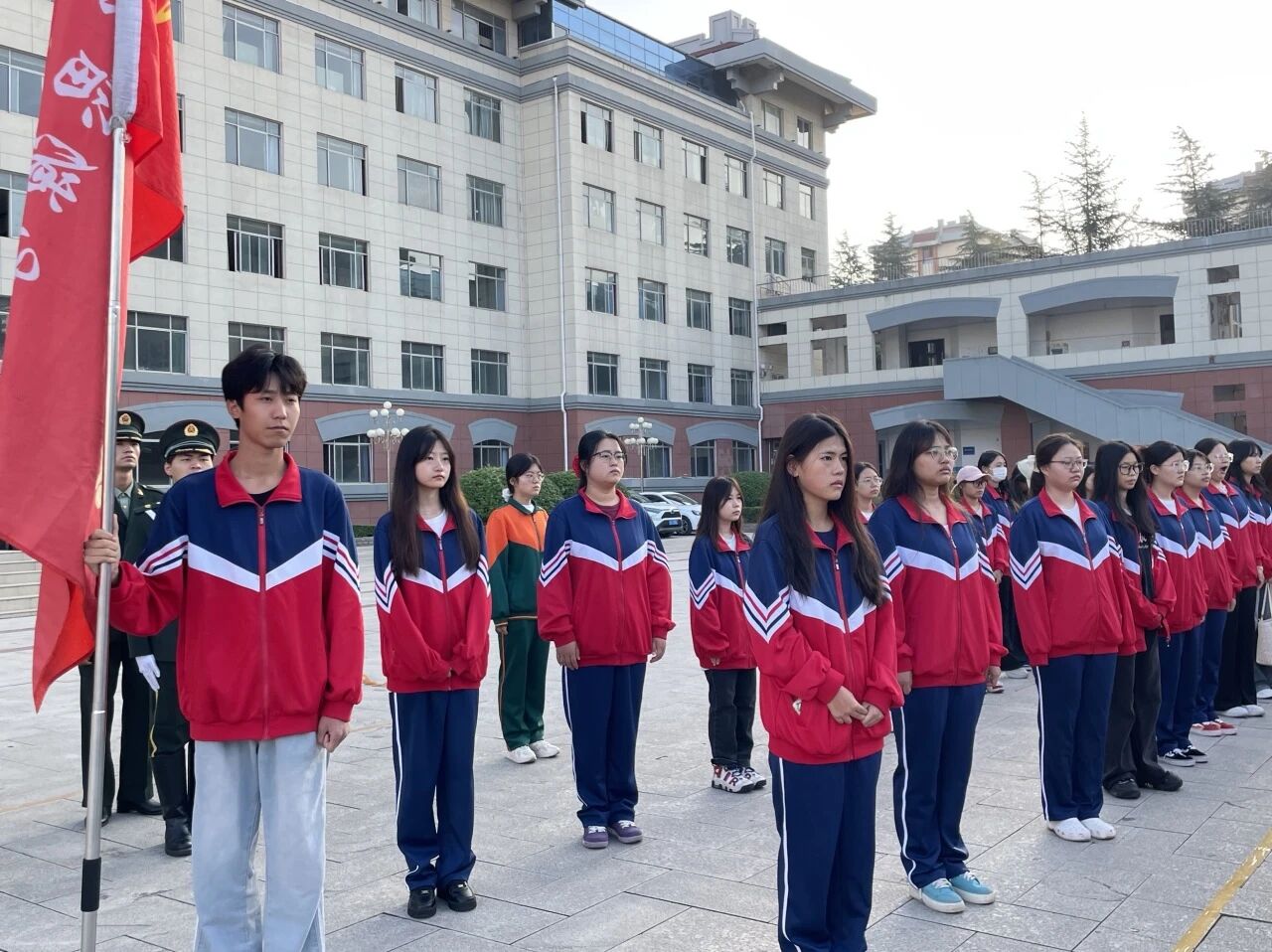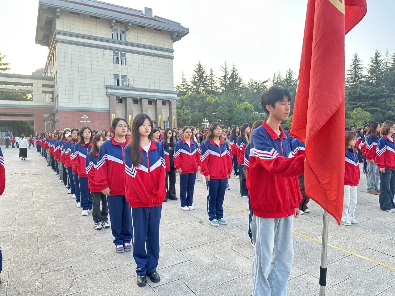 天色微明,教育学院学生代表身着整齐校服,有序聚集在中心楼前,参加学校的升国旗仪式。伴随着雄壮激昂的国歌声,五星红旗冉冉升起,新生们身姿挺拔、目光坚定,在庄严肃穆的氛围中感受家国情怀与青春使命。