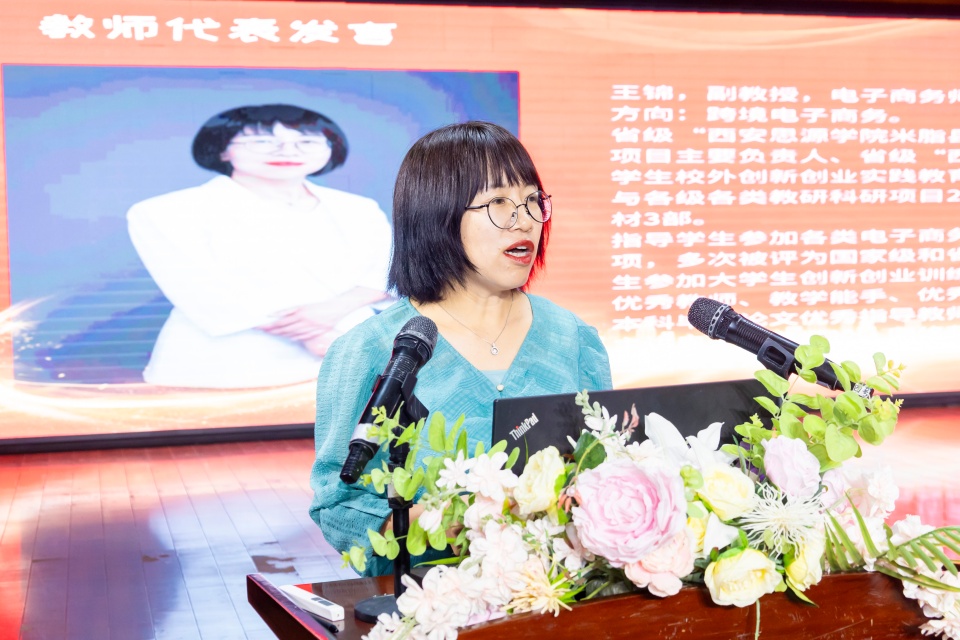 教师代表电子商务专业王锦老师发言。她与全体同学分享了三个关键词:一是“扎根”,从认真听好每一堂课、做好每一次作业、参与好每一个实践项目开始;二是“创新”,希望大家敢闯敢试,多去实训室里动手操作,多和老师探讨专业困惑,多和同学组队参加竞赛;三是“温度”,在这里学到的不仅是专业知识,更能感受到一份同学间、师生间的温暖和信任。