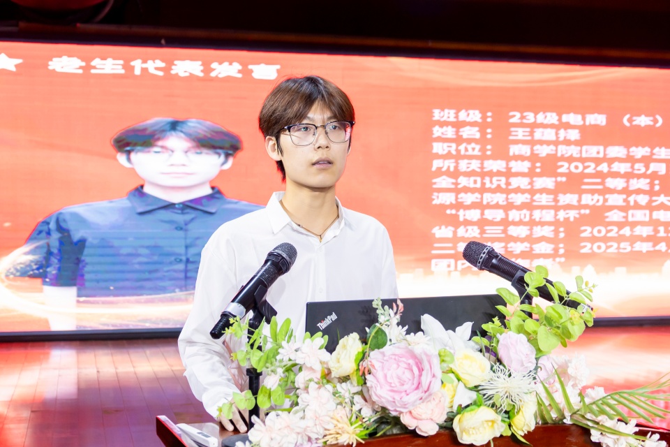 老生代表2023级电子商务专业王蕴择同学发言。他通过自身经历为新生提供了借鉴,并寄语了三点希望:一是无论何时,别丢了“学习”这个根本;二是无论何事,保持“独立思考”的能力;三是无论何地,主动“多做一步”。