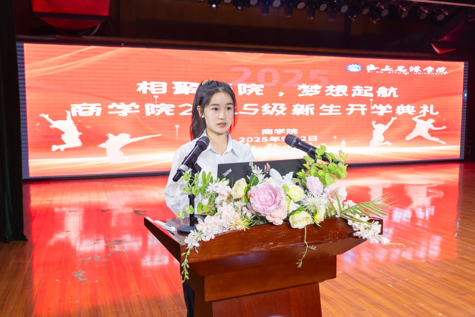 新生代表2025级国际经济与贸易专业董佳乐同学发言。她指出大学是新的起点,也是新的体验。她表示:一要是筑牢专业根基,持续提升综合素养;二要注重实践创新,积极拥抱真实挑战;三要参与多元活动,实现全面个性发展,并祝愿2025级新生能在商学院度过人生中美好的时光,不负时代、不负韶华、不负思源!