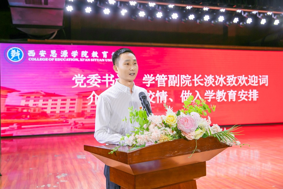 会上,教育学院党委书记、学管副院长淡冰致欢迎词,并介绍西安思源学院校史校情、安排入学教育计划。他代表学院全体师生,向2025级新生表示最热烈的欢迎和最诚挚的祝贺。随后,详细介绍了学校从西安交通大学机械工程学院培训中心起步到民办高等教育探索之路,从“培训教育”到“高职教育”从“高职教育”到“本科教育”27载的奋斗历史,阐述了思源“敢闯敢拼、逆天拼搏”的精神内核,也明确了“强本升硕”的共同目标。