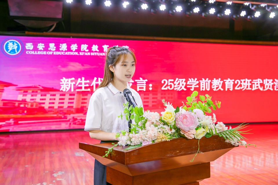 随后,新生代表、2025级学前教育专业2班学生武贤溪满怀激情地发言。她表达了初入校园的兴奋与期待,承诺在思源要做课堂上的学习者,更做生活里的实践者,积极参与学科竞赛、社会实践,把书本里的知识转化为解决问题的能力,在实践中检验成长、收获真知。会心怀远大抱负,不畏惧未知的挑战,敢于突破自我、勇于创新,像航海者一样扬起理想的风帆,朝着目标坚定前行。