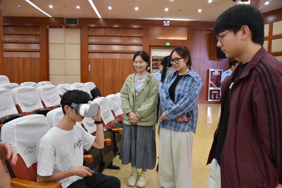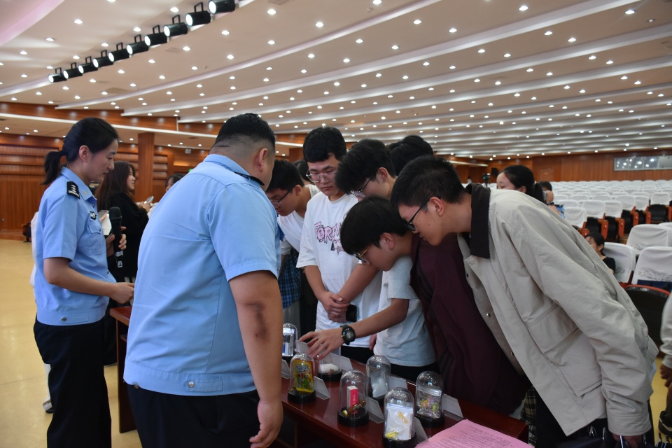 为让安全教育更直观、更深刻,活动现场还设置了禁毒实物展示区与沉浸式体验环节。展示区陈列海洛因、冰毒、大麻等常见毒品样本,民警手把手教新生辨别特征;3D眼镜体验区前,新生们通过沉浸式视觉效果,亲身感受吸毒后产生的眩晕、幻觉等不良反应,直观体会毒品对神经系统的毁灭性伤害,进一步强化了“远离毒品、守护健康”的坚定信念。