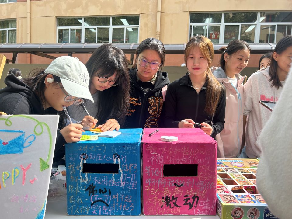 最具温情的当属“情绪交换盲盒”环节。现场摆放着两个情绪盲盒,一个用于投放“消极情绪”,学生可匿名写下近期的烦恼、焦虑或开心的小事;另一个则装满了“积极情绪”,学生也可匿名把自己开心的事投进情绪箱。参与学生可互相抽取纸条,在匿名交换中实现情绪共鸣与互助。