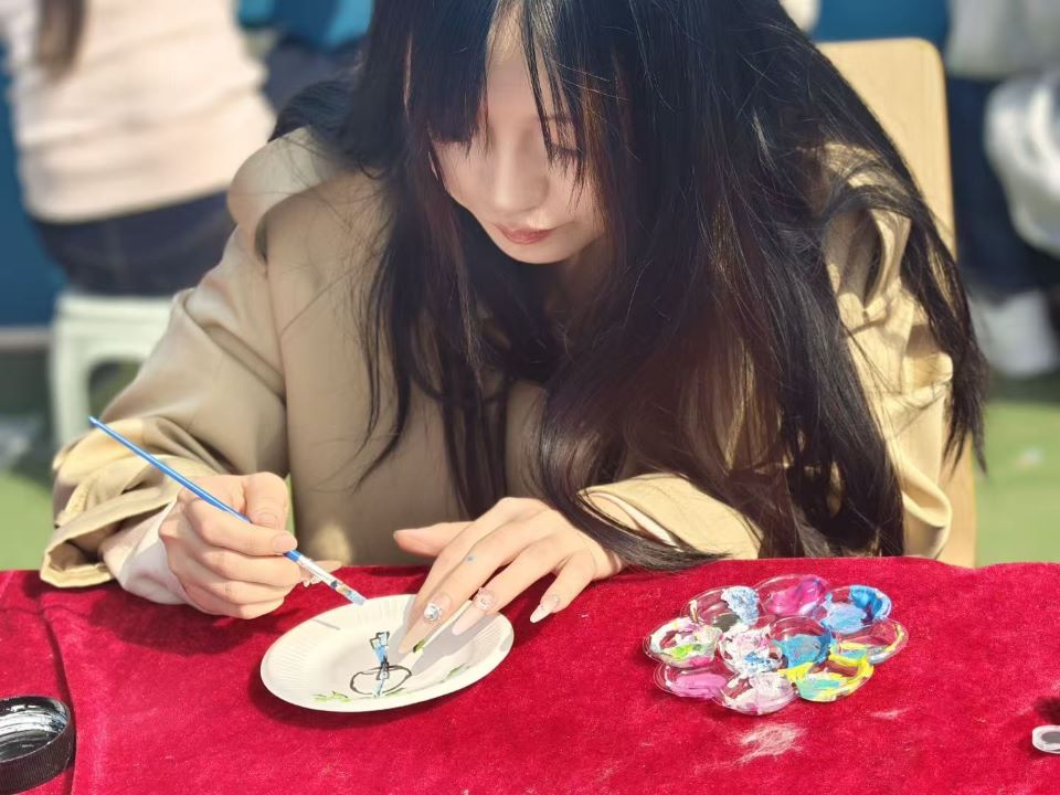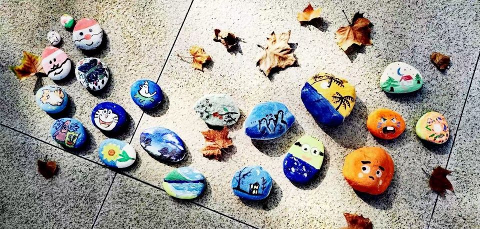 活动现场,形态各异的鹅卵石被用作创作载体,学生们围坐成组,手持颜料笔进行创作。从创作内容来看,部分学生选用清新的蓝绿色系,展现对校园的喜爱;另有学生以温暖的橙黄色系为主色调,表达与朋友相处的愉悦感受;还有学生通过深浅交织的紫色线条,呈现学业压力下的复杂心境。创作过程中,学生们同步交流各自的创作思路与灵感,现场氛围从初始的安静逐步转变为热闹温馨。