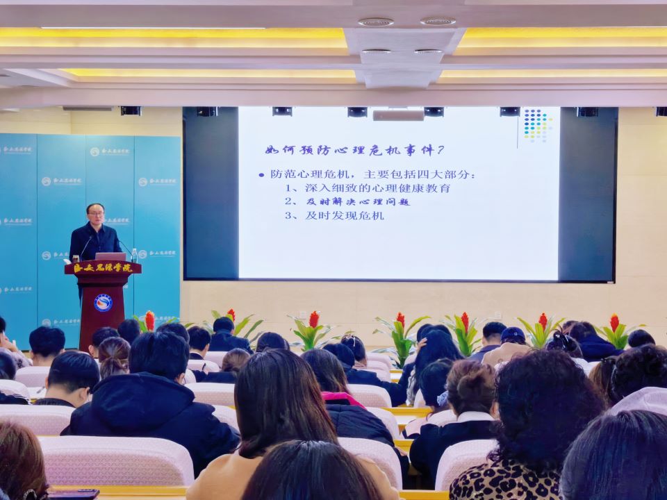 姚斌教授围绕认识心理危机、大学生常见精神疾病、自杀与自杀预防、心理危机预防工作四个方面展开,结合自身丰富的理论研究与实践经验,深入分析了大学生心理危机事件的成因、处理过程及反思点,姚斌教授强调了大学生心理危机预防的重要性,重点介绍了大学生心理障碍的表现和程度、大学生常见心理疾病、精神疾病的处理以及如何帮助自杀倾向者,为我校老师们提供了实用的处理方法。