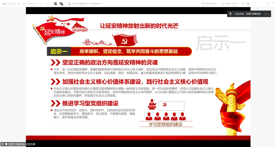 为筑牢青年学子理想信念之基,深刻感悟党的奋斗历程与伟大精神,近日,商学院学生第三党支部于10月23日在线上举办了“弘扬延安精神 砥砺奋进初心”主题党日活动。本次活动由支部宣传委员张欣蕊同志主持,支部全体党员同志参加。
