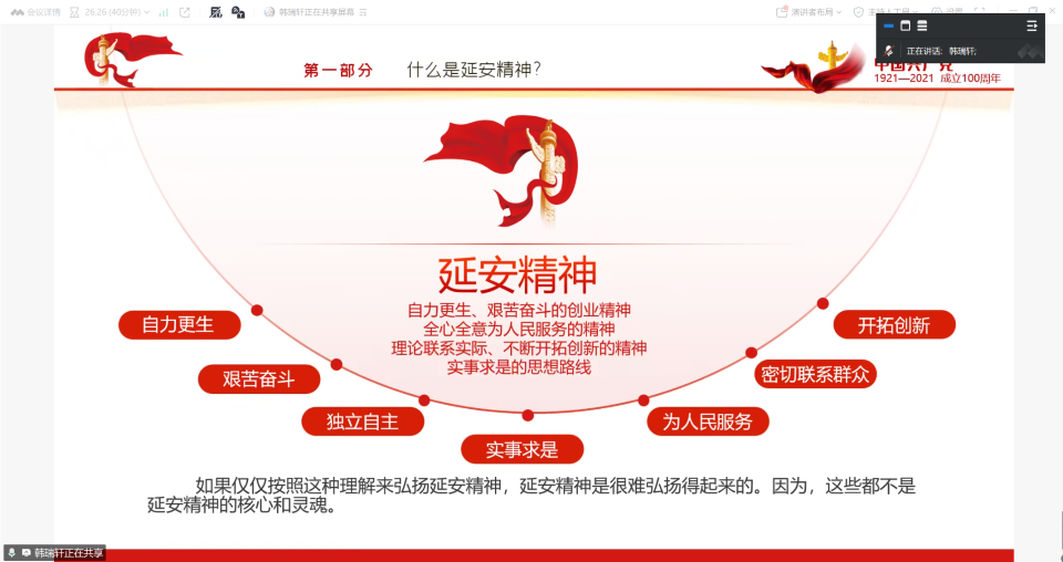 曹粉茹和韩瑞轩两位同志围绕延安精神的内涵与时代价值进行了专题分享。他们以生动的语言和详实的史料,系统梳理了延安精神形成的时代背景,深刻解读了其以“坚定正确的政治方向,解放思想、实事求是的思想路线,全心全意为人民服务的根本宗旨,自力更生、艰苦奋斗的创业精神”为核心的科学内涵。分享者指出,延安精神是我们党的宝贵精神财富,是滋养初心、淬炼灵魂的“营养剂”,激励着我们在新时代的长征路上永葆政治本色,不断攻坚克难。