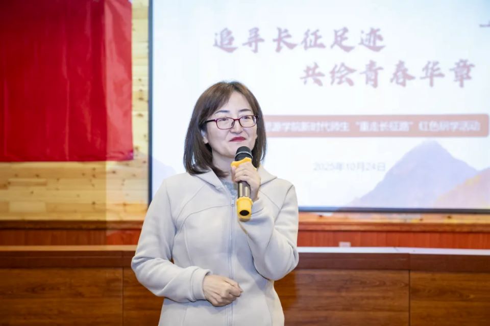 抵达哈达铺后,马克思主义学院院长甘永霞为“重走长征路”研学师生们上思政课,她从“为什么要长征”这一问题展开深入讲解,以翔实的历史资料展示了当时革命面临的严峻形势,通过系统梳理长征中的重要事件,阐述了从“被迫转移”到“伟大转折”的历史进程,引导研学师生深刻认识到,这是我们党在挫折中奋起、在困境中重生的生动写照。随后学生进行了讲述长征中革命故事的活动。2023级小学教育专业(本)04班李婧婷、2023级小学教育专业(本)06班曹雨菲 、2023 级小学教育专业(本)04班李焱馨、2024级电气工程及其自动化专业(专升本)02班殷实分别讲述了《半袋干粮》《金色鱼钩》《一双草鞋》《炊事班长的铜锅》等红色故事,表达了对革命前辈们无私奉献、以坚定的理想信念战胜艰难困苦的崇敬之情。