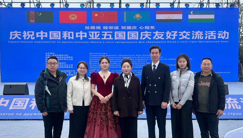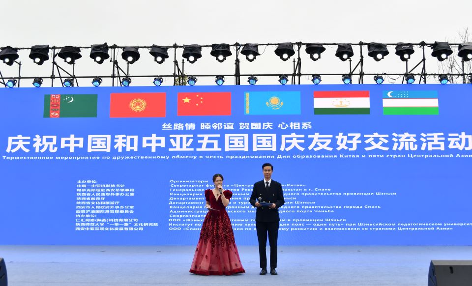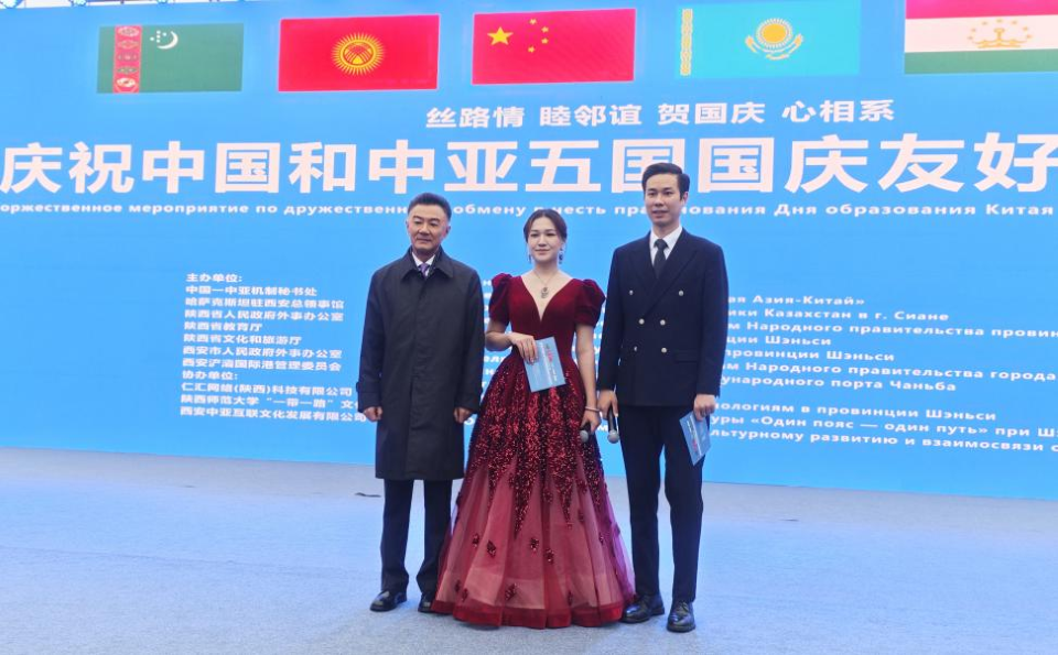 2025年10月21日,以“丝路情、睦邻谊,贺国庆、心相系”为主题的“庆祝中国和中亚五国国庆友好交流活动”,在西安浐灞国际港中亚公园隆重举行。陕西省第十二届政协副主席魏增军、中国—中亚机制秘书长孙炜东、中国—中亚机制第一副秘书长柯伊舍巴耶夫先生和夫人、哈萨克斯坦驻西安总领事馆参赞阿拜、陕西省文化和旅游厅厅长高阳、省教工委副书记王海波、西安市委常委、副市长许克涛、省社会组织国际交流促进会副会长李安军、西安浐灞国际港管委会主任杨兵、西安市人民政府办公厅副主任郭民、西安市对外友好协会专职副会长张锐、西安浐灞国际港管委会副主任陈静等领导,以及驻陕外交机构代表,马来西亚驻西安总领事林雲亮、柬埔寨王国驻西安总领事兴波、香港特别行政区政府驻陕西联络处主任陈静仪参加了庆祝活动。受主办方邀请,我校文学院汉语国际教育专业吉尔吉斯斯坦留学生明珠同学与我校2013届优秀校友梁震共同主持了该庆祝活动。