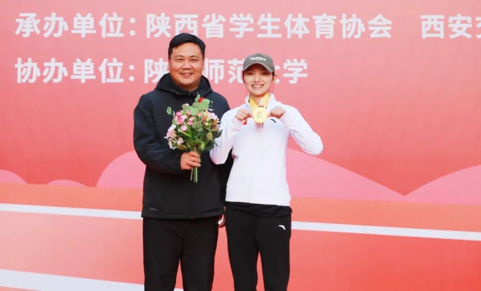 大数据管理学院2024级市场营销专业(专)学生王思敏(左)荣获女子甲组铁饼第一名,并打破该项目纪录,与西安思源学院体育学院院长、田径队教练钟华(右)合影留念