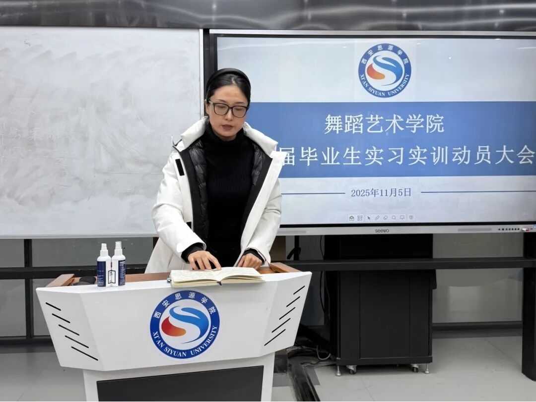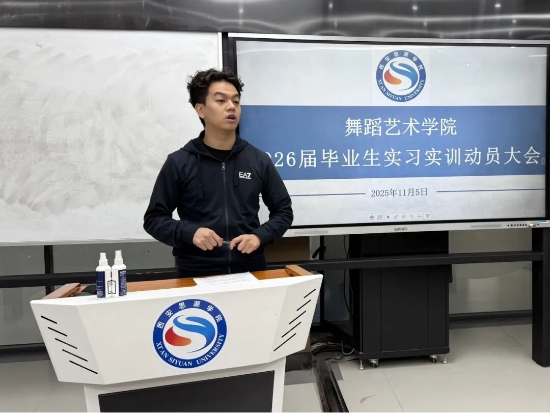 为全面落实舞蹈艺术学院2026届毕业生实习实训工作部署,强化学生对实习实训环节的认识与重视,11月5日中午,西安思源学院舞蹈艺术学院召开2026届毕业生实习实训动员大会。舞蹈艺术学院院长刘少敏、学管副院长张伟明、舞蹈表演专业全体教师及辅导员出席会议,2023级舞蹈表演专业全体毕业生参会,会议由任敬老师主持。