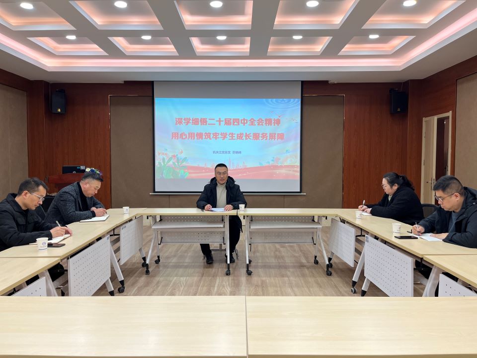 2025年11月20日,机关三党总支在大学生创新创业训练展示中心群英会会议室召开“深学细悟二十届四中全会精神,用心用情筑牢学生成长服务屏障”主题党日活动。会议紧扣全会“一体推进教育科技人才发展”“办好人民满意的教育”重大部署,结合机关三党总支各部门职能定位,明确将全会精神转化为学生服务实效的行动路径。机关三党总支全体委员参会。