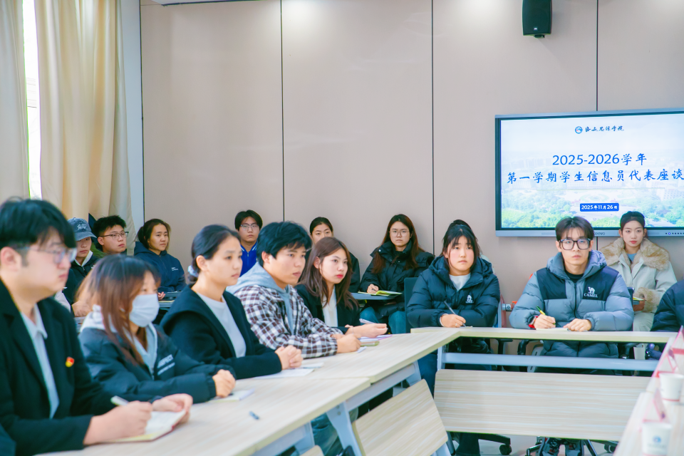 为进一步落实学生信息员制度,及时收集学生反馈信息,深入了解学生需求与成长状况,保障教育教学工作规范有序运行,持续提升教育教学管理质量。2025年11月26日下午,教育教学质量督导处在图书馆智慧教室204组织召开了2025-2026学年第一学期学生信息员代表座谈会。教育教学质量督导处、教务一处、教务二处、学生处相关职能处室领导老师出席会议,来自各二级学院不同专业年级的48名学生信息员代表参加会议。座谈会由教育教学质量督导处质量监控科邢丹秋老师主持。