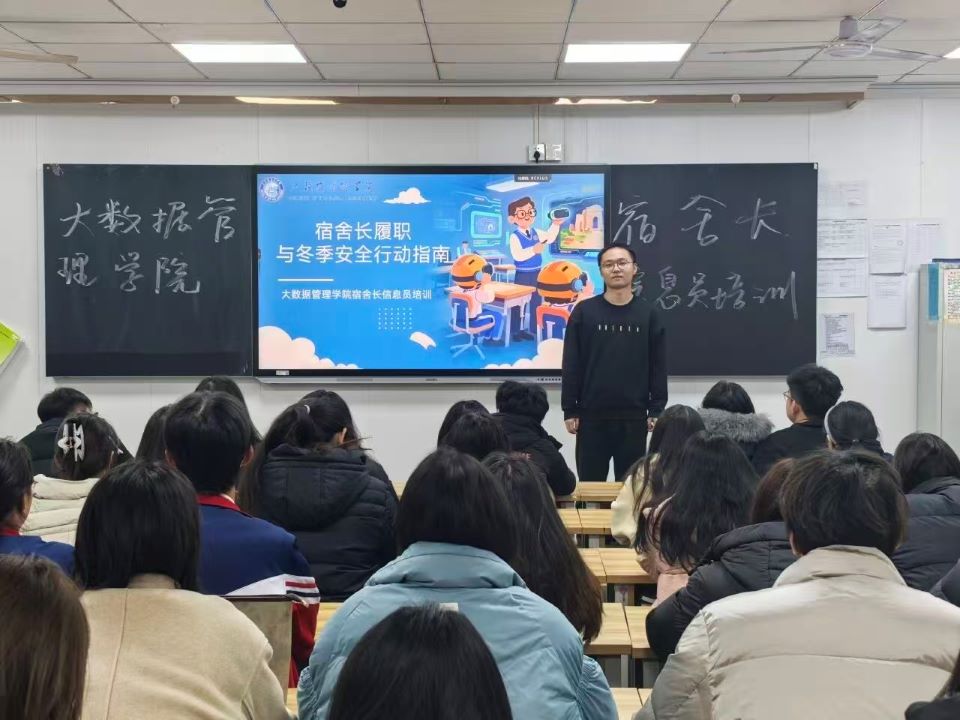 为落实教育部宿舍网格化管理及学校工作要求,压实校园安全底线,提升宿舍长责任意识与履职能力,充分发挥其“桥梁”“帮手”作用,大数据管理学院于2025年12月4日在中心楼相关教室召开宿舍长信息员培训会,旨在强化学生安全责任,共护平安文明宿舍家园。