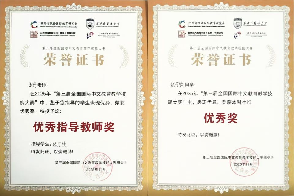 2025年11月22日,全国第三届国际中文教育教学技能大赛在西安外国语大学举办。西安思源学院文学院经过初赛选拔,选派组织学生参赛并安排专任教师指导。汉语国际教育专业李梦圆、张可欣、周肆伟三名学生荣获大赛本科生组优秀奖,李蓓蕾、姜行、许芸青三位老师荣获优秀指导教师奖。