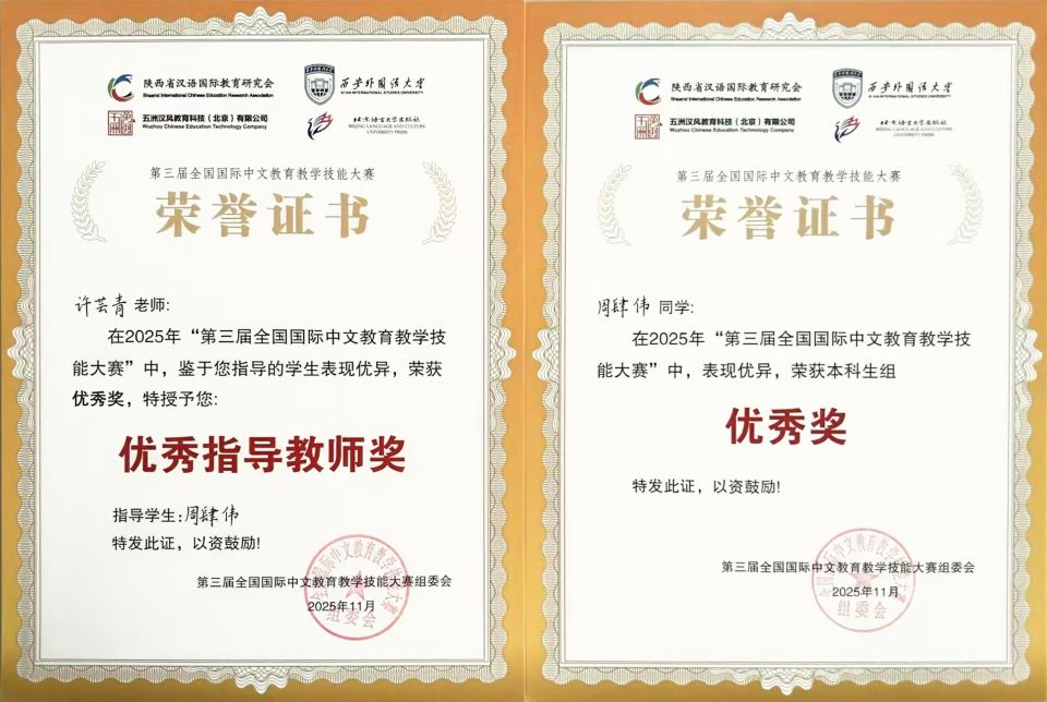 从课堂实训到赛场角逐,从教学设计到文化展演,三位学子的优异表现,是学生个人努力和教师悉心栽培的成果,也充分检验和展示了文学院汉语国际教育专业的人才培养质量与成效。未来,文学院将继续积极鼓励师生参与高水平专业竞赛,持续推动专业建设与学科发展,为培养更多具备创新精神、跨文化沟通能力和国际视野的国际中文教育优秀人才贡献力量。(文/周肆伟,图/许芸青)
