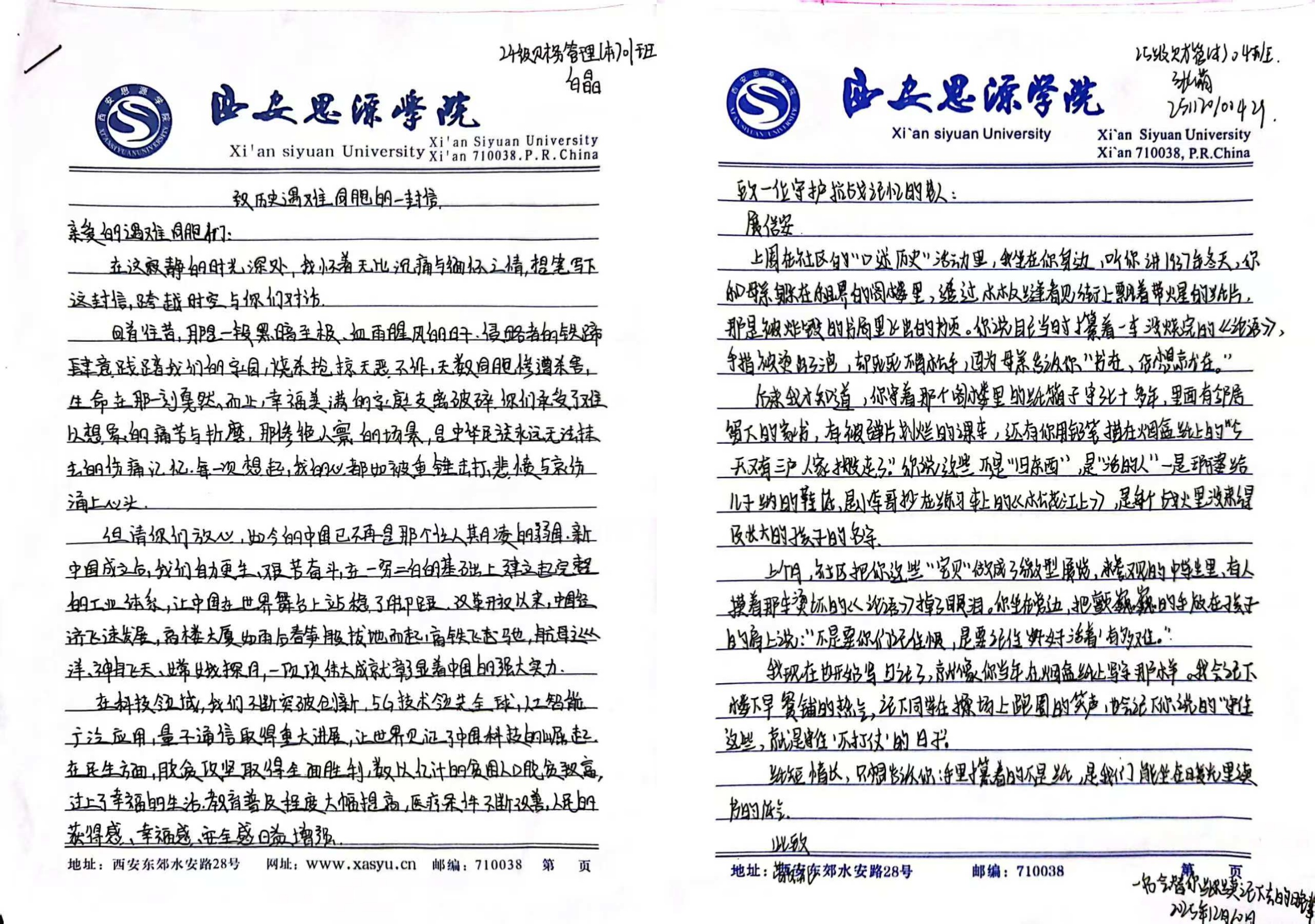 “时空邮箱”活动为学子们提供了一个静心沉思、对话古今的情感空间。同学们提笔凝思,或向历史深处的同胞寄去无尽缅怀与告慰,或向革命先烈表达崇高敬意,亦或向未来许下关于责任与和平的庄重诺言。一封封书信跨越时空,承载着真挚情感与深沉思考。