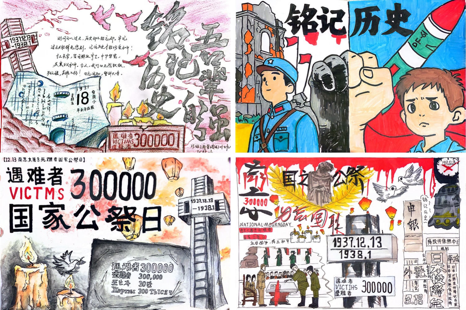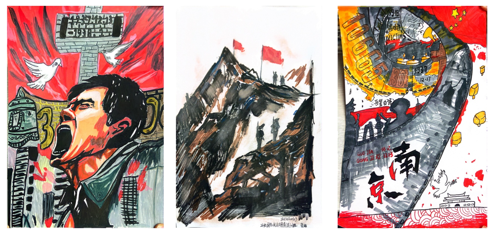 同学们充分发挥艺术才华,以画笔为媒,以色彩为言。参赛作品或凝重悲怆,勾勒山河旧殇;或明亮昂扬,描绘和平愿景。一幅幅精心创作的海报、书法和绘画,生动传递了铭记历史教训、珍爱当下和平、共创美好未来的强烈愿望。