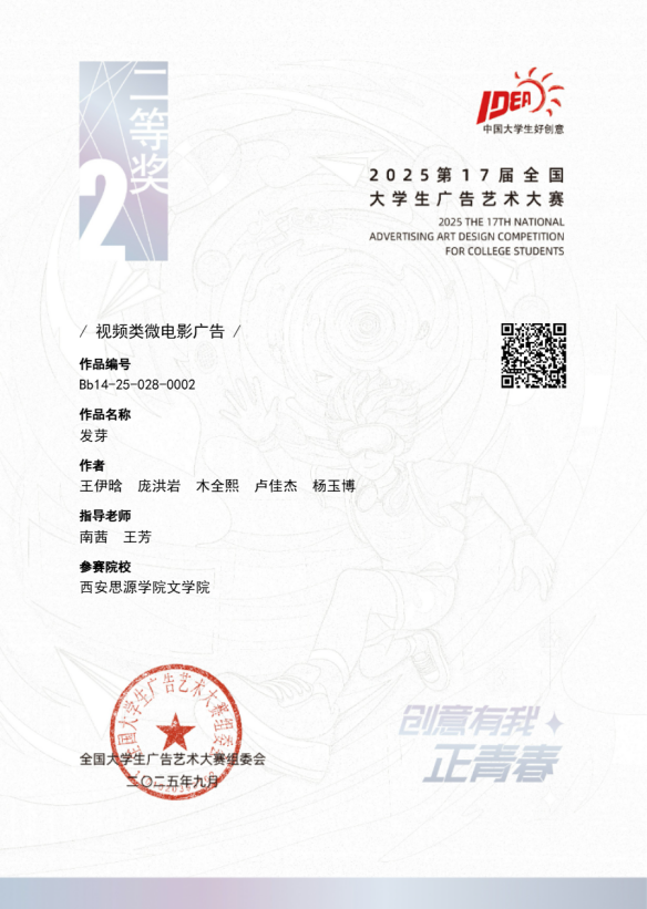学生作品层面更是捷报频传。由网络与新媒体专业南茜、王芳老师悉心指导,王伊晗、庞洪岩、木全熙、卢佳杰、杨玉博同学联合创作的作品《发芽》,以精巧的策略构思、扎实的执行功底脱颖而出,荣获国家级二等奖。本届赛事中,文学院学子不负众望,共斩获国家级二等奖 1 项、国家级优秀奖 3 项,省级二等奖 11 项、省级三等奖 10 项,累累硕果是师生协同发力、精益求精的生动写照,更离不开学校领导及教务一处的悉心指导与大力支持。
