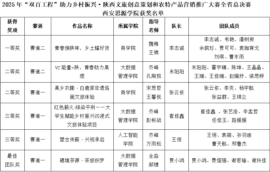 这些成绩背后,离不开校长周延波对该赛事活动的高度重视和各二级学院的大力支持以及老师们给予的悉心指导。该赛事不仅彰显了我校学子凝聚集体智慧与力量、将课程知识灵活运用于实践的卓越能力,更展现出他们高度的参与热情与积极性、突破学科界限的创新潜力,以及勇于迎接挑战的坚韧品格与实干精神。最为珍贵的是,学生们在了解农业农村发展现状的同时,锻炼了调查研究、沟通协调和解决实际问题的能力,以青春智慧助力乡村振兴,展现了新时代西安思源学院青年学子服务国家战略的责任担当与深厚情怀。