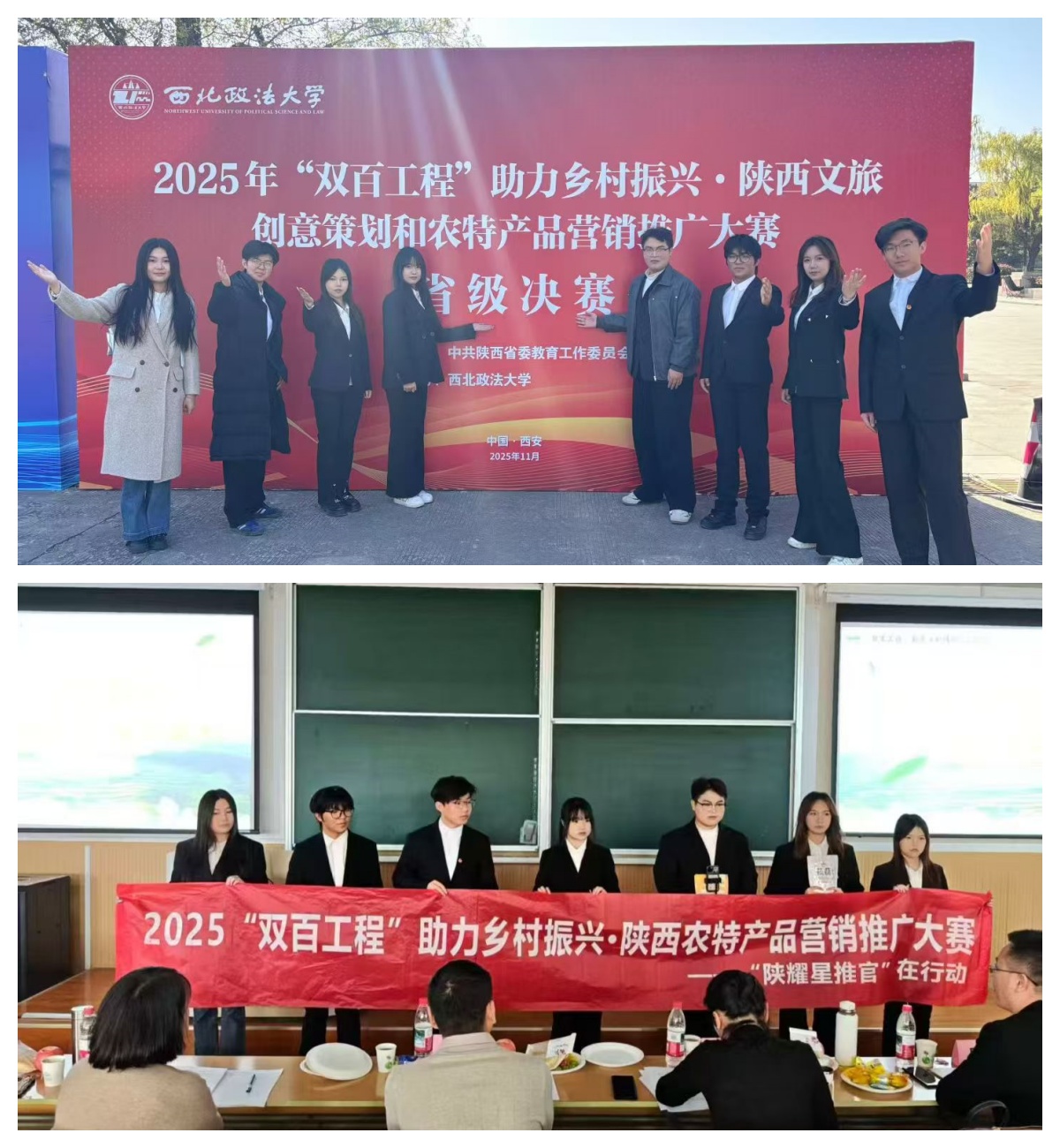近期,由中共陕西省委教育工委主办的2025年“双百工程”助力乡村振兴·陕西文旅创意策划和农特产品营销推广大赛已圆满闭幕。我校晋级全省高校总决赛的六支学生团队均荣获奖项,分别取得一等奖一项、二等奖两项、三等奖两项及最佳团队奖一项的好成绩。