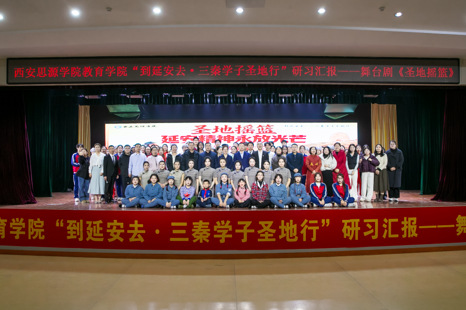 为深入贯彻落实《中共陕西省委关于加快建设文化强省的意见》与《新时代陕西省立德树人工作指南》精神,深化思政教育改革创新,营造沉浸式、体验式的思政育人氛围,巩固“到延安去·三秦学子圣地行”思政实践活动成效,西安思源学院教育学院于2025年12月18日在大学生创新创业训练展示中心二楼举办“到延安去·三秦学子圣地行”研习汇报——舞台剧《圣地摇篮》首场演出。