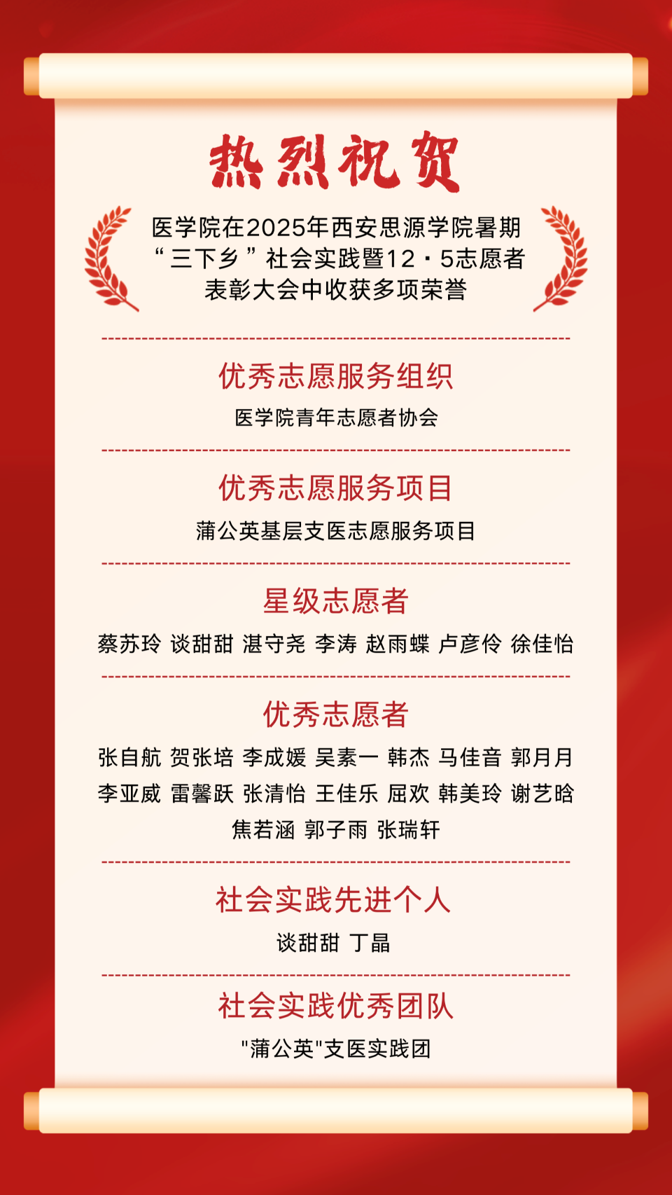 践初心深耕基层沃土 担使命斩获志愿荣光——医学院学子在2025年西安思源学院暑期“三下乡”社会实践暨12·5志愿者表彰大会获多项荣誉
