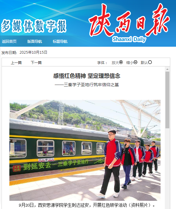 西安思源学院相关负责人说,学校将以此次研学为契机,帮助2025级新生在历史与现实的交融中校准人生坐标,探索出“思政课程与课程思政同向同行”的有效路径,继续深化“三全育人”综合改革,将红色基因融入育人全链条,让延安精神滋养青年成长,培养担当民族复兴大任的时代新人。