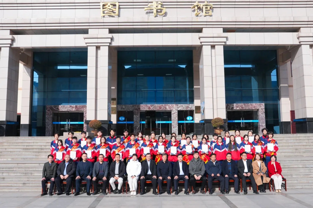 全体与会领导、嘉宾及获奖学生在图书馆门前合影留念