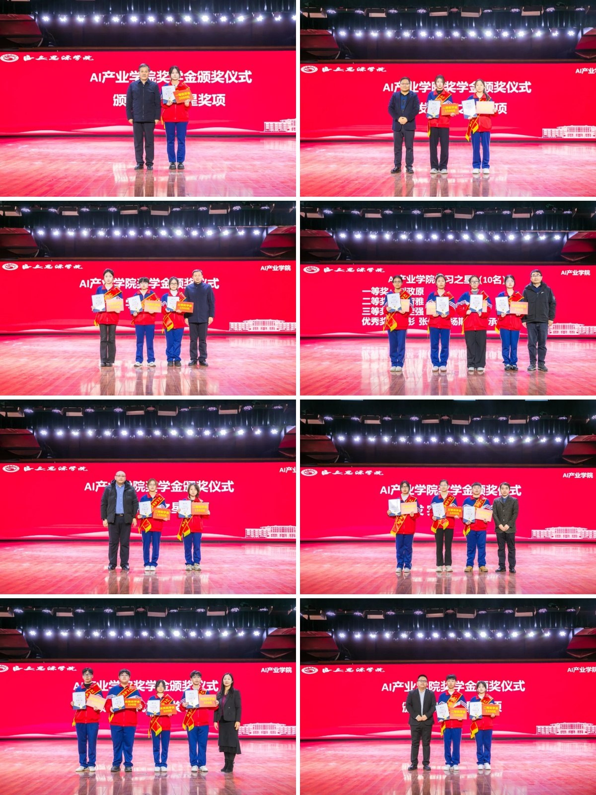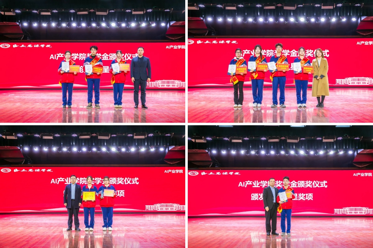 揭牌仪式后,大会进入AI产业学院企业奖学金颁奖环节。海南博涵教育项目经理陈佳谊宣读了表彰决定。本次共颁发“学习之星”“实践之星”“创新之星”三类个人奖项及“先进集体”团队奖项,30名优秀学生和1个团队获得表彰。学校与企业领导分别为获奖学生颁奖,激励他们再接再厉,树立榜样力量。