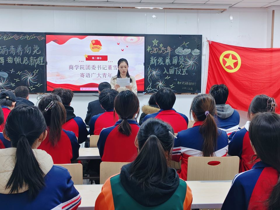 薪火相传,踔厉奋发。为进一步加强共青团组织建设,凝聚青年力量,激励广大团员青年坚定理想信念、担当时代责任,2025年12月25日,商学院团委举行“砥砺青春心向党 商海扬帆启新程——2025年新发展团员入团仪式”。学生处副处长,商学院辅导员陈建甫、商学院党委书记黄洪松、商学院团委书记董雪松、商学院学生第二党支部书记周之玲出席本次仪式。入团仪式由赵子轩主持。
