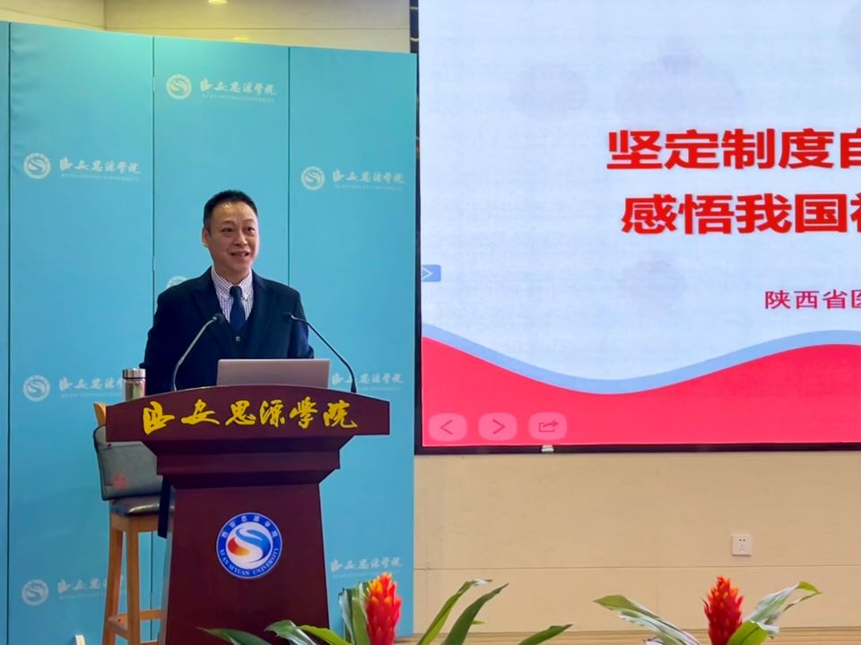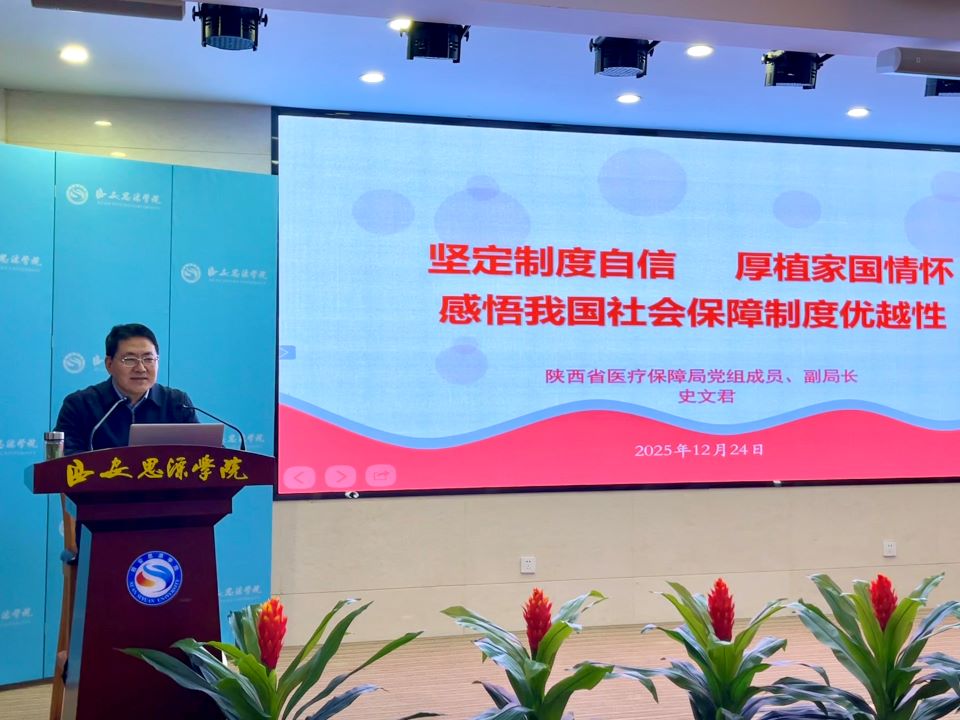 为深入贯彻落实习近平总书记关于学校思政课建设的重要指示精神,学习贯彻党的二十大精神、党的二十届历次全会精神和全国教育大会精神,教育引导学生坚定马克思主义信仰、中国特色社会主义信念,坚定制度自信,厚植家国情怀。2025年12月24日,陕西省医疗保障局联合西安思源学院医学院,在教学报告厅举办以“坚定制度自信 厚植家国情怀——感悟我国社会保障制度优越性”为主题的思政课进校园活动。陕西省医疗保障局党组成员、副局长史文君,陕西省医疗保障局(人事处)三级调研员耿亮,西安思源学院校长助理、医学院院长张进生,西安思源学院党总支书记、学管副院长马晓斌参加活动。活动由西安思源学院党委委员、宣传部部长朱强主持。本次思政课进校园活动共有医学院180余名师生代表参与。