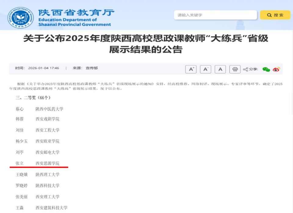 近日,中共陕西省委教育工委、陕西省教育厅公布了2025年度陕西高校思政课教师“大练兵”省级展示活动获奖名单。西安思源学院马克思主义学院教师张立荣获二等奖,成绩的取得彰显了学校对思政工作的高度重视,展示了学校思政教育发展的成绩,体现出我校思政教师的风采。