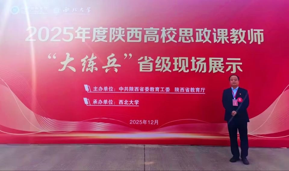 2025年 12月24日陕西高校思政课教师“大练兵”省级现场展示在西北大学举行,来自全省80所高校的166名教师被划分为13个组别进行了现场展示。今年省级展示采用现场抽题授课与案例分析相结合的形式,充分展现出我校思政课教师扎实过硬的专业素养和昂扬向上的精神风貌。我校马克思主义学院教师张立通过现场抽题和案例分析,从教学语言、教学板书等方面,全方位展现了学校思政课教师扎实的理论功底、良好的教学能力,体现了学校推动思政课教育教学改革的突出成效。