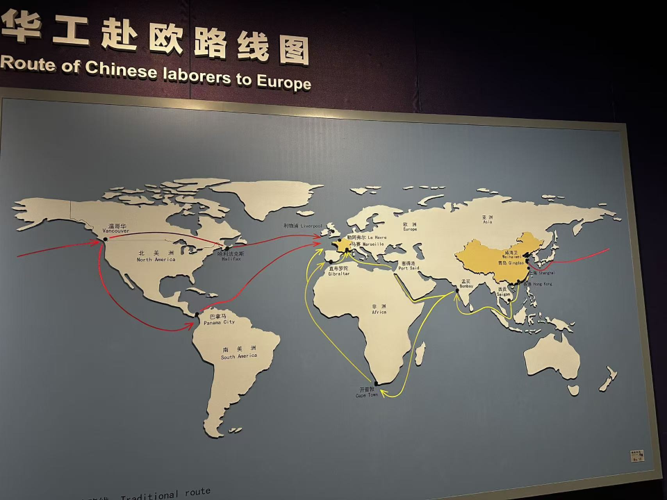 在观影厅,纪录片《华工忠魂录——一战华工军团纪实》中的炮火战场、华工抢修工事的震撼画面,以及“谨以此片纪念一战时远赴欧洲战场的14万华工”的片尾字幕,让人深受震撼。展区内的“一战华工明信片”“上海一战休战纪念碑照片”等实物史料,进一步展现了华工在异国他乡的坚韧品格与无私奉献精神。此外,关于留法俭学运动与华工运动关联的史料,让他了解到周恩来、邓小平、蔡和森等先辈曾在法国接触华工、传播革命思想,深刻认识到华工既是中国走向世界的重要桥梁,更为早期共产主义思想的传播奠定了群众基础。