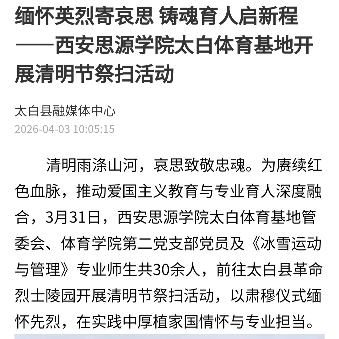 太白县融媒体中心:缅怀英烈寄哀思 铸魂育人启新程——西安思源学院太白体育基地开展清明节祭扫活动