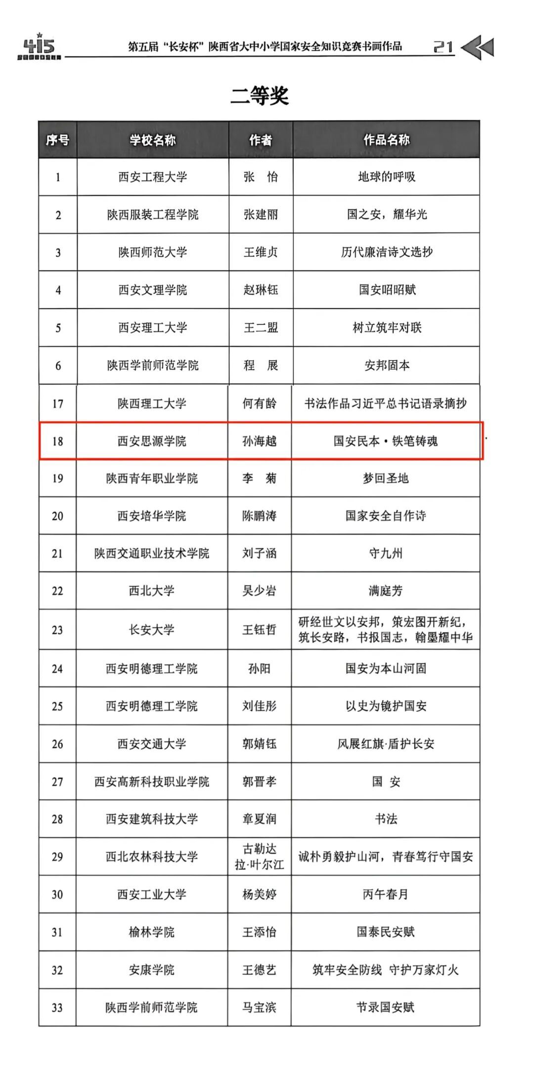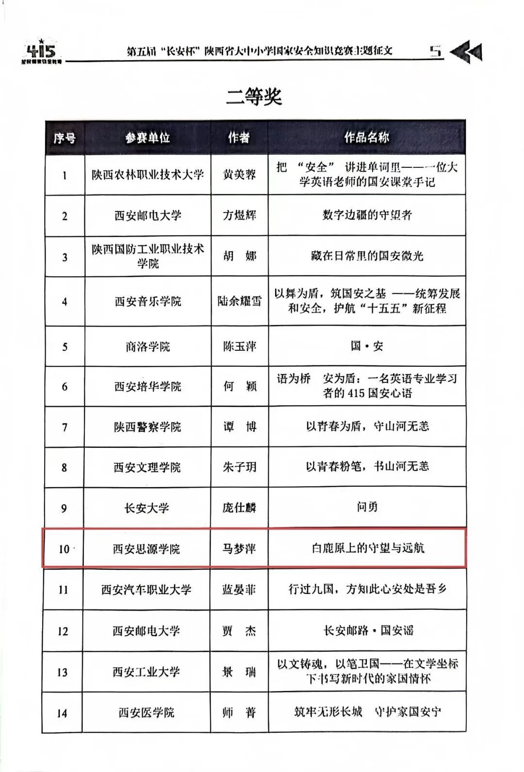 在由省委国安办、省委教育工委、省教育厅、省国家安全厅联合主办的第五届“长安杯”陕西省大中小学国家安全知识竞赛中,我校高度重视、广泛动员,组织师生积极参与网络答题、主题征文、书画作品、教学视频征集等系列活动,荣获主题征文二等奖一项三等奖一项,主题书画二等奖一项三等奖两项,充分展现了思源学子扎实的国家安全知识素养与昂扬向上的精神风貌。